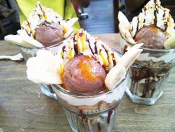 店内はまるで女子会だった。その中で男3人でジャンボパフェ(笑)。パスタセットを頼むとドリンクがついてくるが、メニュー表にはさりげなくソフトドリンクのグラスビールが並んでいって際立っていた(笑)。