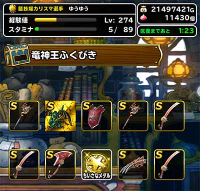 ドルクマが役に立ったことがあった(笑)。確かオーガキングかもんばん。バハムートのおかげで初の全勝狙えるかもしれない。今までは圧倒的火力不足で亡者が発動しても不利な状況で2ターンにもつれこまれ、負けてたパターンが多かったので。サージタウスにメタルむそうをつけてるが、闘技場で使わないので、別の何かをつけるかも。こごえる吹雪とか、手に入れば(笑)。