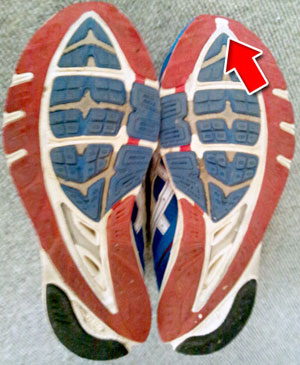 普通、踵の外側から磨り減っていくが、この靴だけは異例。走っているとき、どうもつま先が滑るな~と思っていたら、写真のとおりこんな状態になっていた。珍しい。