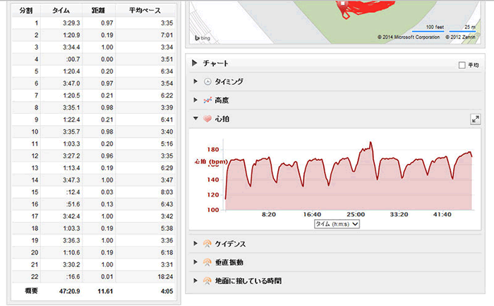 500mを8本。リカバリー50秒ジョグ。1と3と5と7本目が追い風で、あとは向かい風。タイムが7本目のほうが速いが、8本目の向かい風のほうが追い込んでいる。心拍数は最初の2本は誤作動(笑)。まぁ、それでも以前のハートレートモニターと比べると安定性はかなり良くなった。